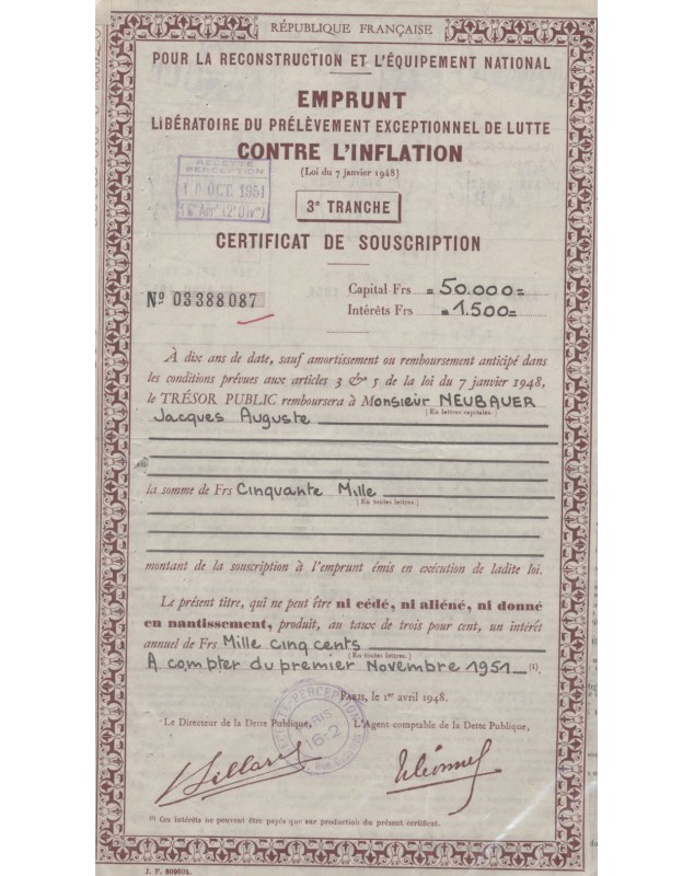 République Française, pour la Reconstruction et l'Equipement National - Emprunt Lutte contre l'Inflation