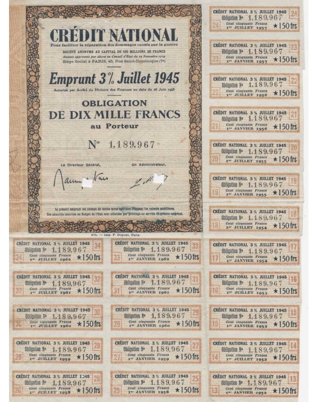 Crédit National pour faciliter la réparation des dommages causés par la guerre - Emprunt 3% Juillet 1945