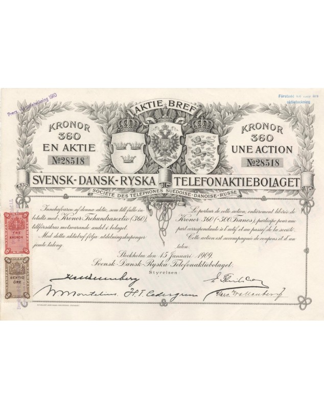 Certificate of 1 share of 360 Kronor (or 500 francs) issued in Stockholm in 1909.