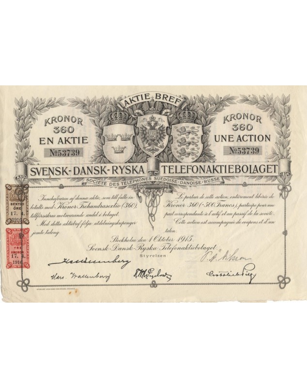 Certificate of 1 share of 360 Kronor (or 500F) - Stockholm 1915