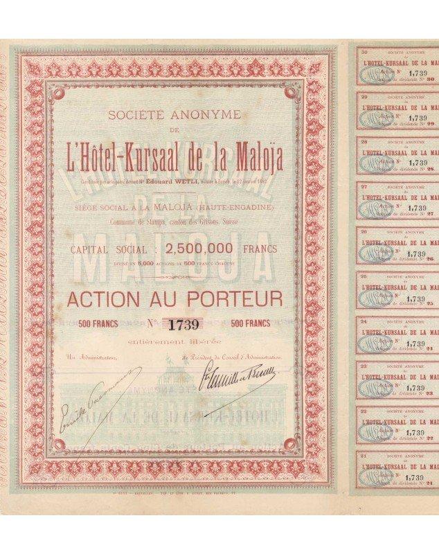 Share of 500 francs to bearer issued in La Maloja, Stampa (Canton des Grisons) 1882