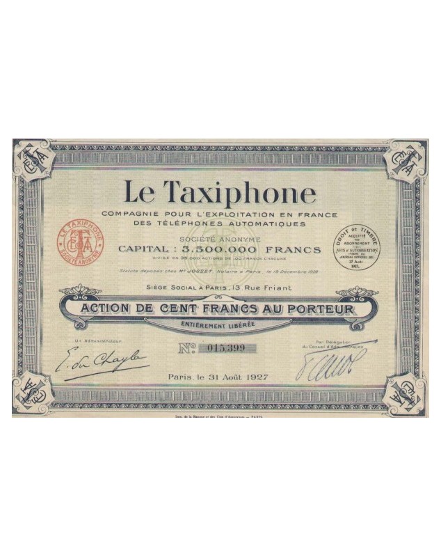 Share of 100 francs ti the bearer issued in Paris in 1927.