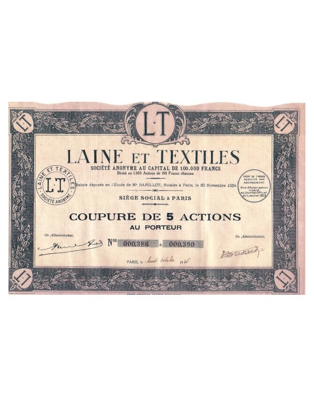Cert. of 5 shares - Paris 1925