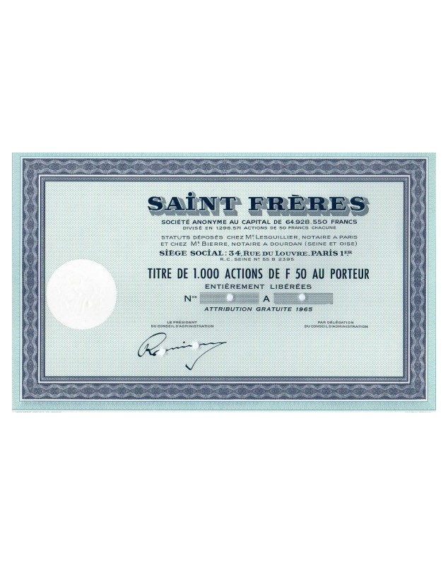 Cert. of 1,000 shares of 50f - Paris 1955 - Unissued