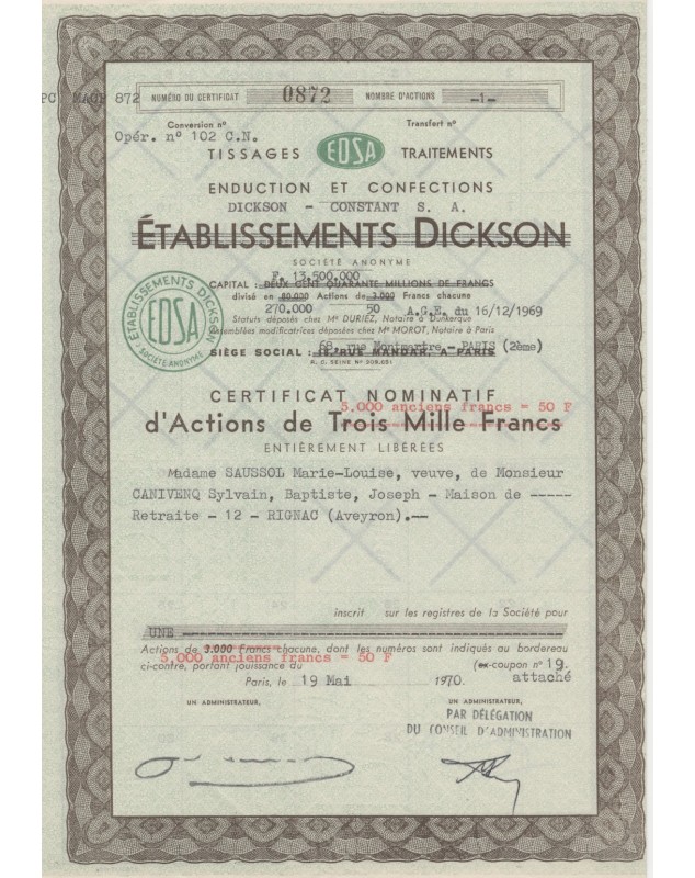 Certificat nominatif de 3000F corrigé de 50F - Paris 1970