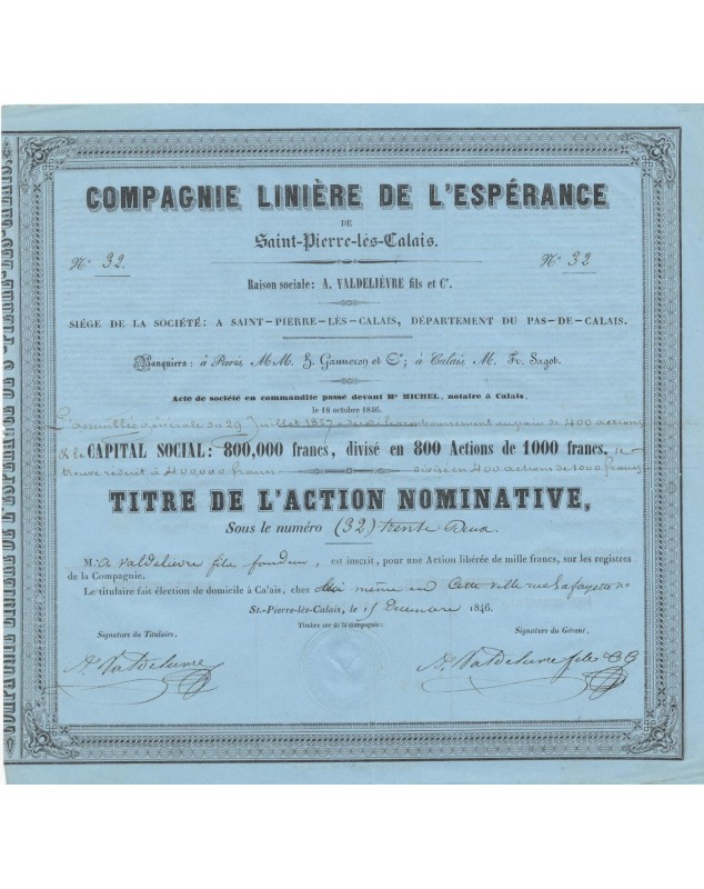 Certificate of the nominative share - St. Pierre-lès-Calais 1846