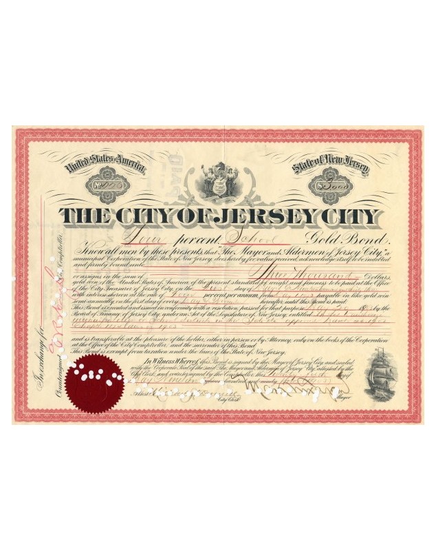 4% Gold Bond of 3,000$ - Jersey City - Cancelled