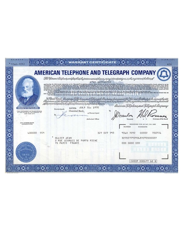 Certificate of two warrants, dated 1970. Countersigned by the Chemical Bank.