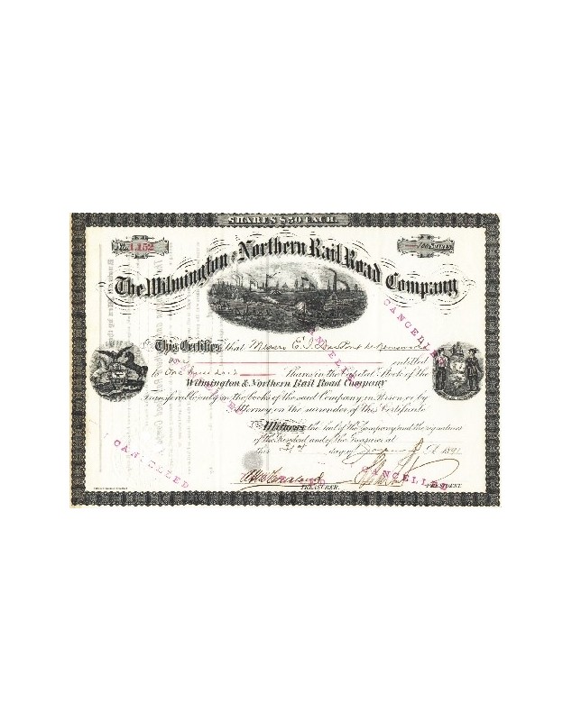 Certificate of 100 shares of $50 ea. issued to Henry Du Pont de Nemours & Co. and signed by Henry A. Du Pont as President in 1891. Colonel Henry Algernon Du Pont (1838-1926). Industrialist, politician, U.S. senator (1906-17) Grandson of E.I. Du Pont who made his fortune from gunpowder. He won Medal of Honour for action at Cedar Creek 1864 during the Civil War.