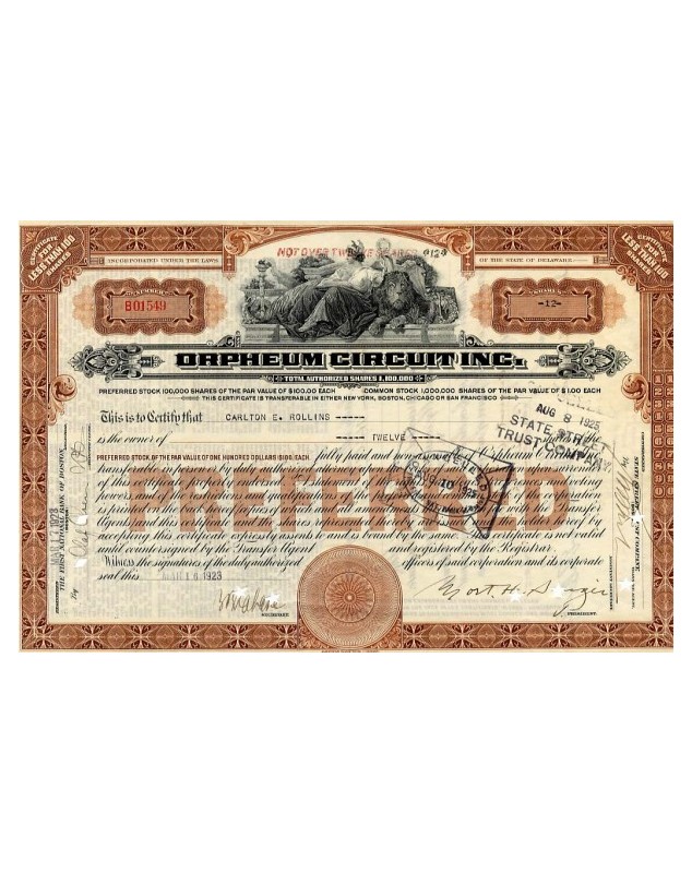 Cert. of 12 shares of 100$ ea. - Delaware 1923