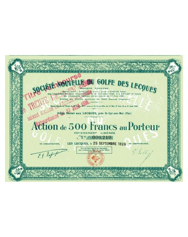 Share of 500F - Les Lecques 1926 (Near St-Cyr/Mer - Var)