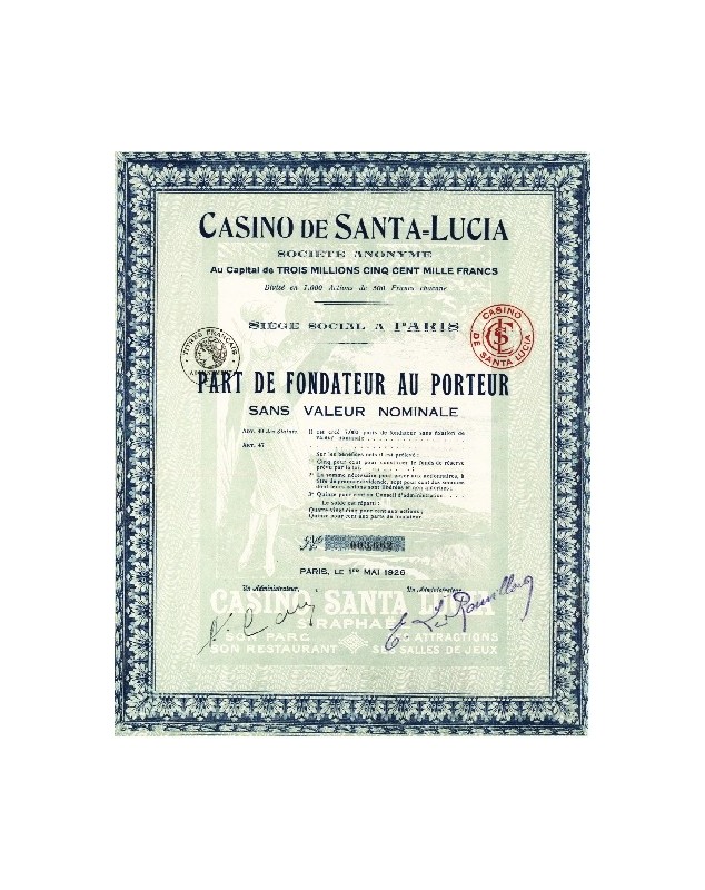 Founder's bearer share issued in Paris in 1926. The casino located in Saint-Raphaël (Var) also offered attractions, games rooms, park, catering. Nice decor in the background.