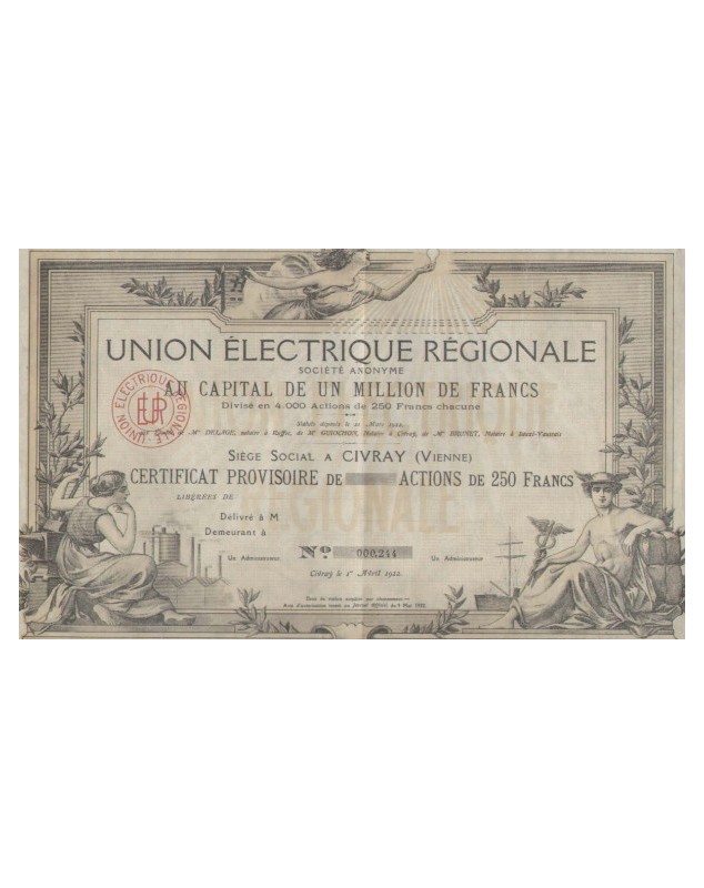 Prov. Cert. of 250F - Civray (Vienne) 1922 Unissued