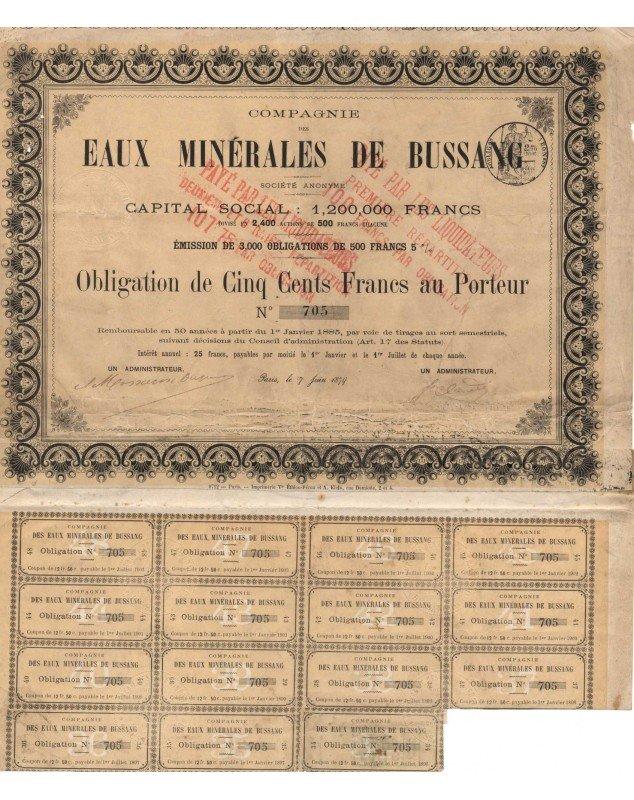 Share of 500 francs to bearer issued in Paris in 1879. This French mineral water company was founded in 1867.