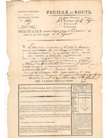 Prix 110,00 €Feuille de route militaire pour le 18e régiment d'infanterie légère, concernant un militaire voyageant isolément de Bréda à Saint Didier (Ain) avec une indemnité par journée de cinq lieues pour le logement. Délivrée par la commission des guerres à Bréda le 21 Frimaire An 13 (12 décembre 1804), avec descriptif des dates et lieux de passage au dos. Ce document offre un aperçu exceptionnel de la logistique militaire française et des mouvements de troupes durant l'occupation française de la République Batave (Pays-Bas actuels).