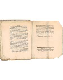 Prix 120,00 €Loi relative à la suppression des congrégations séculières et des confrairies, datée du 18 août 1792 (An 4 de la liberté), émise à Montpellier. Cette législation révolutionnaire représente les politiques anti-cléricales de la Révolution française précoce et la dissolution des organisations religieuses. Ce document est une pièce cruciale pour comprendre les transformations religieuses et sociales de la période révolutionnaire.