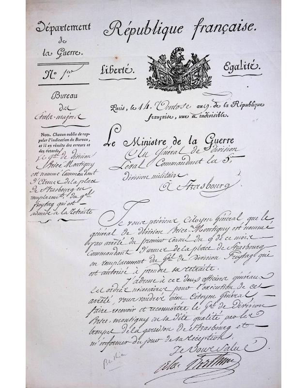 / Louis-Alexandre Berthier à Jean François Leval / Département de la Guerre / Bureau des Etats-Majors / Paris le 14 Ventôse de l'an 9 (5 mars 1801) de la République Française unie et indivisible / Le Ministre de la Guerre au Général de Division Leval Commandant de la 5ème Division Militaire à Strasbourg : « Je vous préviens Citoyen Général que le général de division Brice Montigny est nommé par arrêté du premier consul du 9 de ce mois commandant d'armée de la place de Strasbourg en remplacement du Général de division Freytag qui est autorisé à prendre sa retraite. J'adresse à ces deux officiers généraux les ordres nécessaires pour l'exécution de cet arrêté , vous voudrez bien citoyen général faire recevoir et reconnaître le Général de division Brice Montigny en la dite qualité par les troupes de la garnison de Strasbourg et m'informer du jour de sa réception. Je vous salue. Signé Louis-Alexandre Berthier