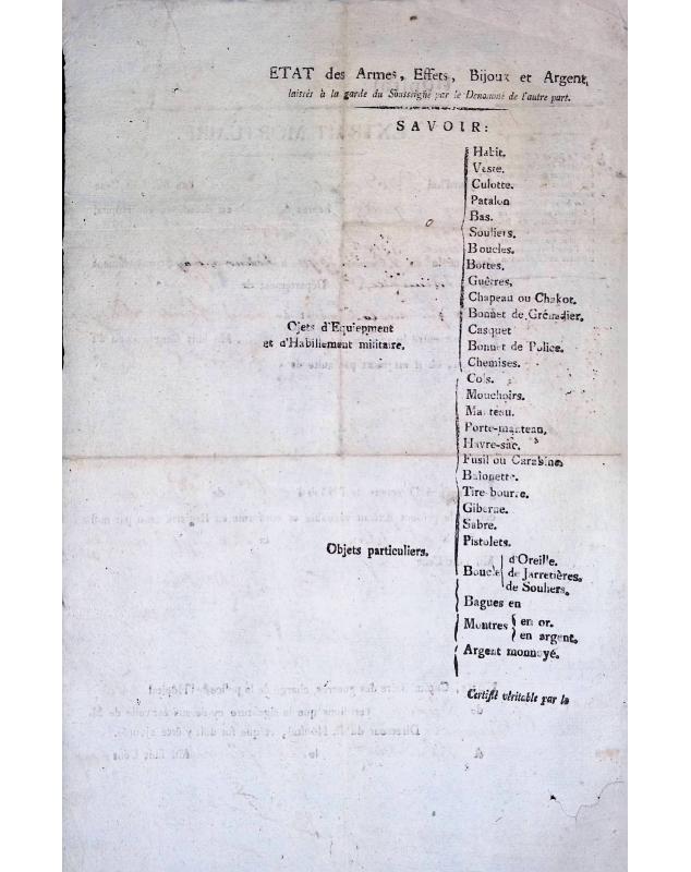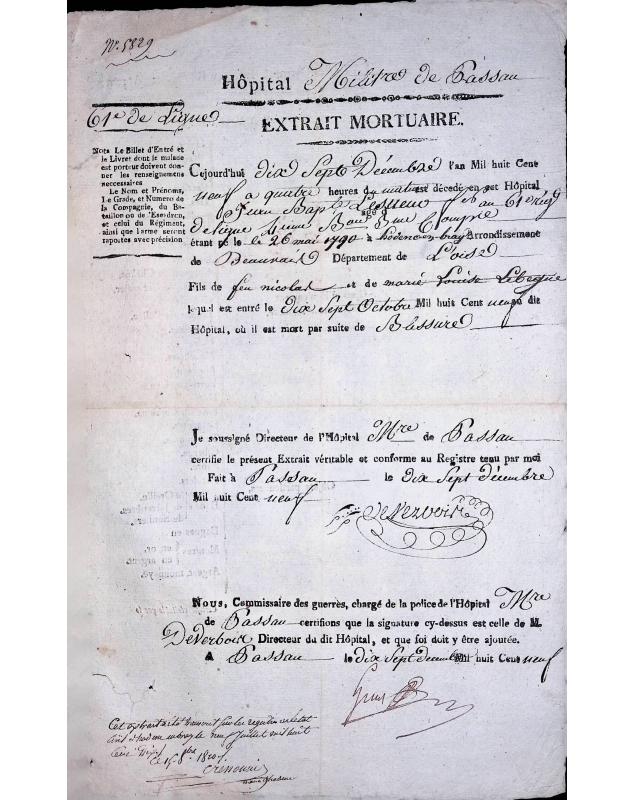 Extrait Mortuaire de l'hôpital militaire de Bassan / Cejourd'hui 17 décembre 1809 à 4h du matin est décédé en cet hôpital Jean Baptiste Lesueur (19 ans) rentré en cet hôpital le 17 octobre 1809 où il est mort par suite de blessures. Au dos de ce document : Etat des armes, effets, bijoux et argents laissés à la garde du soussigné par le dénommé de l'autre part. Signé par le Directeur de l'Hôpital et par le Commissaire des Guerres
