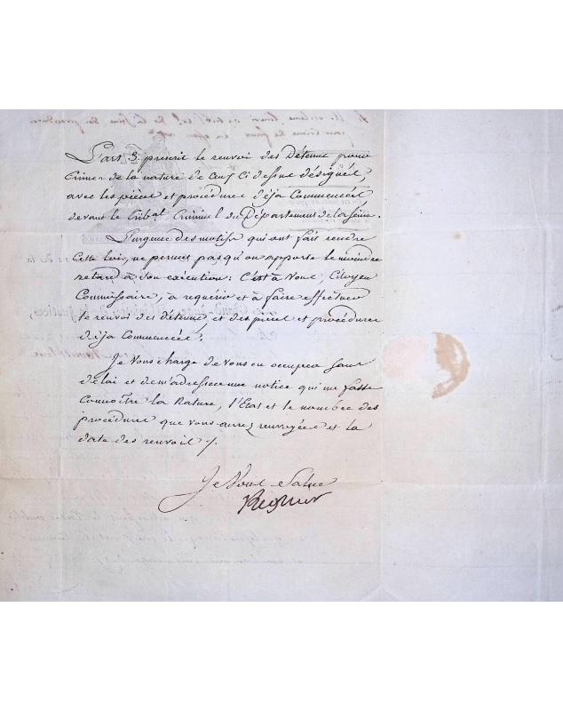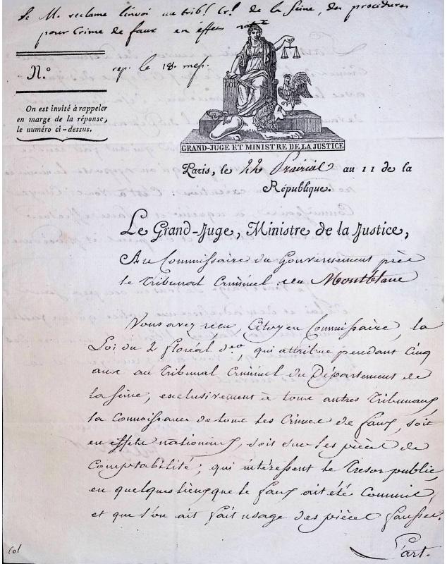 Claude Ambroise Regnier (Ministre de la Justice) pour le Commissaire du Gouvernement (Tribunal Criminel du Montblanc) Paris le 22 Prairial de l'an 11 (11 juin 1803) de la République. Document expliquant la loi du 2 Floréal de l'an 11 sur les crimes de faux.