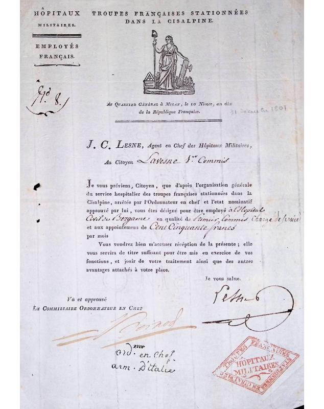 Hôpitaux militaires / Troupes Françaises stationnées dans la Cisalpine / Au quartier général à Milan le 10 Nivose de l'an 10 (31 décembre 1801) / J.C Lesne , agent en chef des hôpitaux militaires au citoyen Lavesne 1er Commis. Désignation pour être employé à l'hôpital civil de Bergame aux appointements de 150 Francs.