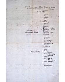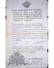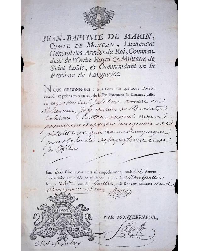 Jean-Baptiste de Marin (Comte de Moncan, Lieutenant Général des Armées du Roi, Commandeur de l'Ordre Royal et Militaire de Saint-Louis & Commandant en la Province de Languedoc) : Laisser-passer pour Mr Jalabert (avocat au Parlement et juge) et permission de se déplacer avec une paire de pistolets pour assurer sa défense. Fait à Montpellier le 26 juillet 1762. Bon pour un an. Signature du Comte de Moncan et contresigné par Monseigneur « Laino »