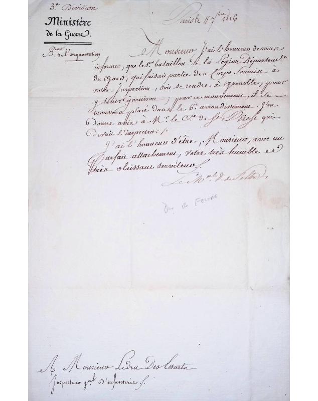 Henri-Jacques-Guillaume Clarke Duc de Feltre au Lieutenant Général Baron François Roch Ledru des Essarts / Paris le 11 septembre 1816 / Lettre informant le déplacement du 1er Bataillon de la Légion Départementale du Gard à Grenoble. Signé le Maréchal de Feltre