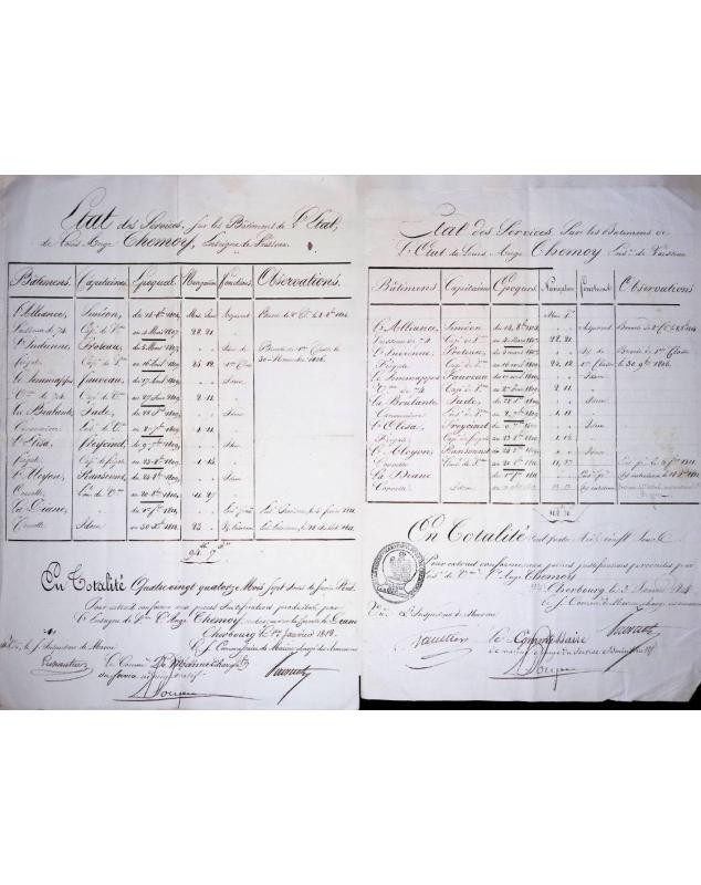 Ensemble complet des états des services maritimes documentant la carrière de Louis-Ange Themoy, enseigne de vaisseau et aspirant, s'étendant de 1810 à 1816. Ces documents officiels ont été délivrés à Cherbourg le 1er mars 1810, le 1er janvier 1813 et le 3 janvier 1814, portant les signatures de l'Inspecteur de la Marine, du Commissaire de Marine chargé des Armements et du Commissaire principal. Un état des services supplémentaire de Brest daté du 1er août 1816 est inclus. Ces documents fournissent un détail exceptionnel sur les carrières navales françaises durant les guerres napoléoniennes et la transition vers la marine de la Restauration bourbonienne, représentant des ressources généalogiques et d'histoire militaire inestimables pour les chercheurs et collectionneurs du patrimoine maritime français.