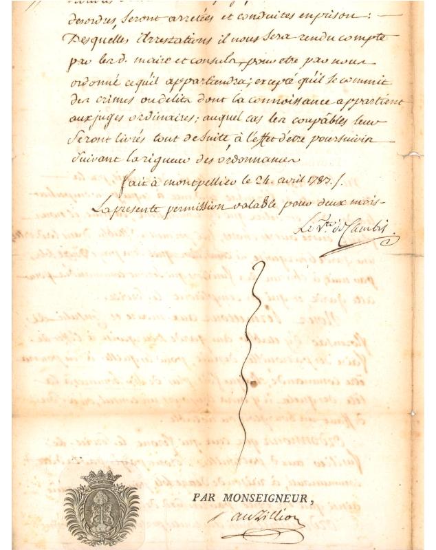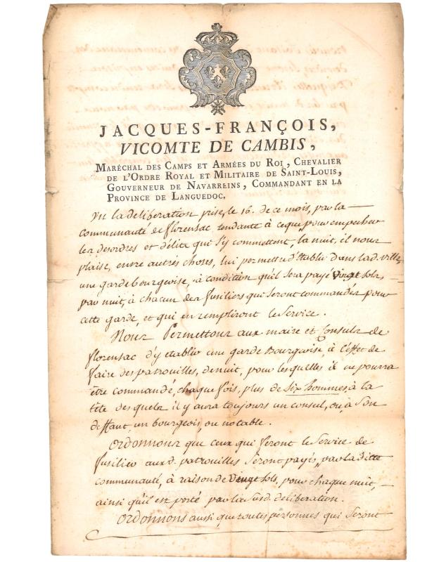 Jacques Francois Vicomte de Cambis (Maréchal des Camps et Armées du Roi, Chevalier de l'Ordre Royal et Militaire de Saint-Louis, Gouverneur de Navarreins, Commandant en la Province de Languedoc) . Fait à Montpellier le 24 avril 1787. Pour la commune de Florensac, Autorisation pour la mise en place d'une garde bourgeoise pour éviter les tapages et délits nocturnes. Signé Le Vicomte de Cambis