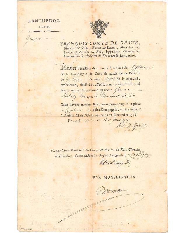 Military appointment document issued by François Comte de Grave, Marquis of Solas, Baron of Lattes, Marshal of the Camps and Armies of the King, and Inspector General of Cannoniers-Gardes-Côtés of Provence and Languedoc. Dated June 12, 1779, this document appoints Jérôme Malvezy Bourgeois as Captain of the Guet company and guard of the parish of Gruissan. Signed by François Comte de Grave and Gabriel-Marie de Talleyrand Comte de Périgord, this piece exemplifies the aristocratic military appointments of pre-revolutionary France.