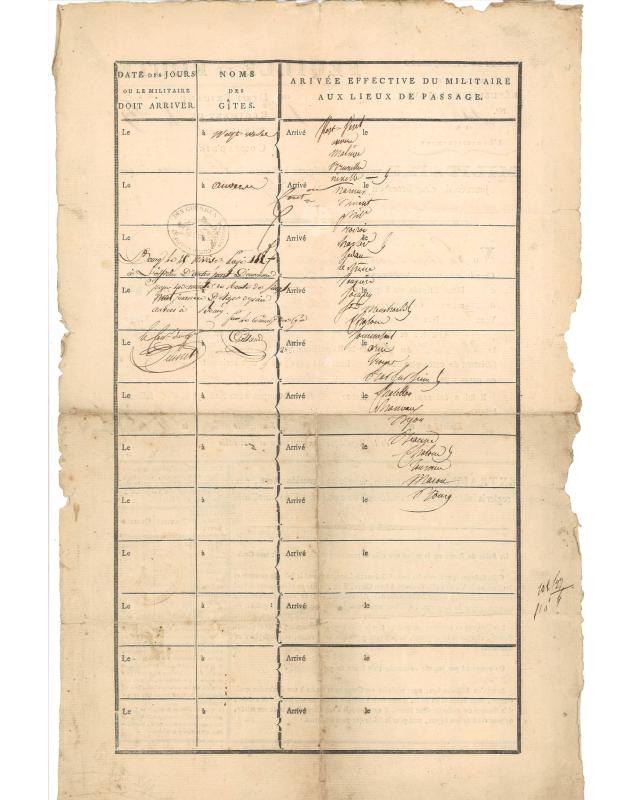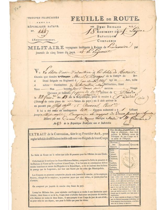 Feuille de route militaire pour le 18e régiment d'infanterie légère, concernant un militaire voyageant isolément de Bréda à Saint Didier (Ain) avec une indemnité par journée de cinq lieues pour le logement. Délivrée par la commission des guerres à Bréda le 21 Frimaire An 13 (12 décembre 1804), avec descriptif des dates et lieux de passage au dos. Ce document offre un aperçu exceptionnel de la logistique militaire française et des mouvements de troupes durant l'occupation française de la République Batave (Pays-Bas actuels).