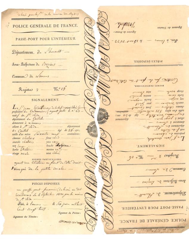 Collection of four interior passports from the early 19th century, issued by the Sub-prefecture of Béziers in the Hérault department. These travel authorization documents were essential for movement within France during a period when internal passports were required for travel between regions. This collection provides insight into the administrative practices and surveillance systems of post-revolutionary France during the Napoleonic and Restoration periods.