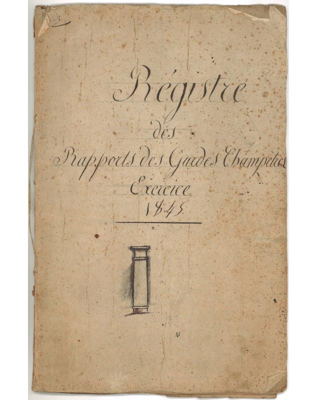 Registre complet des rapports des gardes champêtres de la commune de Florensac dans le département de l'Hérault, daté de 1845. Ce document administratif étendu, représente un enregistrement complet de l'application de la loi rurale et de la surveillance agricole dans la France rurale du XIXe siècle. Ce registre offre un aperçu exceptionnel des opérations quotidiennes de la police rurale, des conflits agricoles, des propriété foncière et de l'administration de la justice dans les campagnes françaises durant la période de la Monarchie de Juillet.