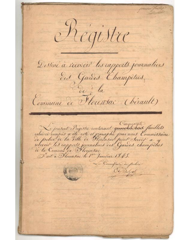 Comprehensive register of reports from the rural police (gardes champêtres) of the commune of Florensac in the Hérault department, dated 1845. This extensive administrative document, represents a complete record of rural law enforcement and agricultural surveillance in 19th-century rural France. This register provides exceptional insight into the daily operations of rural policing, agricultural disputes, property conflicts, and the administration of justice in the French countryside during the July Monarchy period.
