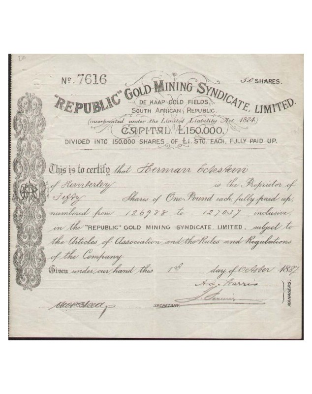 Titre de 50 Actions de £1 ch - 1887