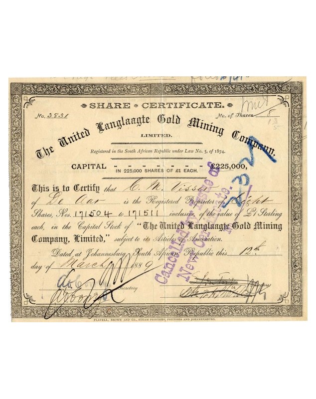 Titre de 8 actions d'1£ - Johannesbourg 1889
