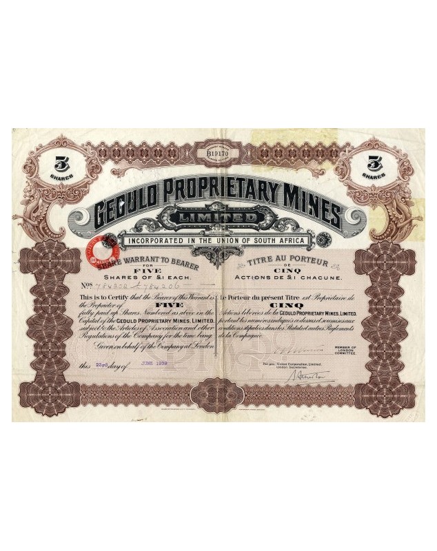 Titre de 5 Actions de 1£ chacune - Londres 1939