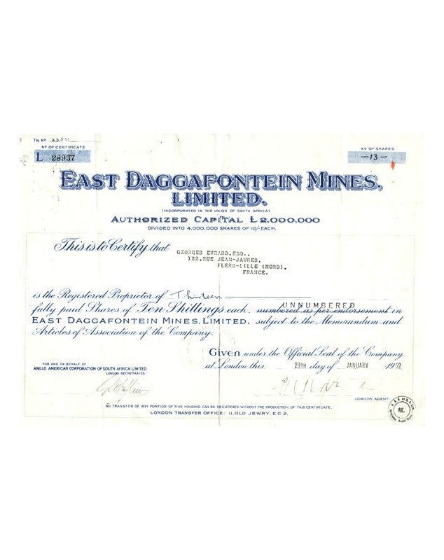 Titre de 13 Actions de 10 Shillings chacune - Londres 1952