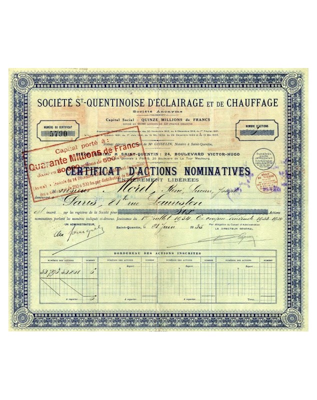 Cert. de 6 Actions de 500F chac. - St-Quentin 1935