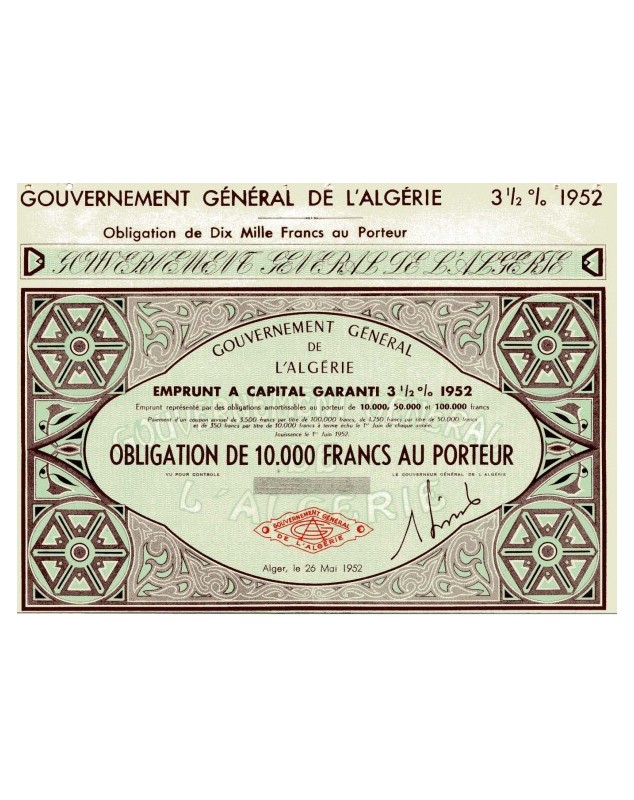 Gouvernement Général de l'Algérie - Emprunt à capital garanti 3,5% 1952