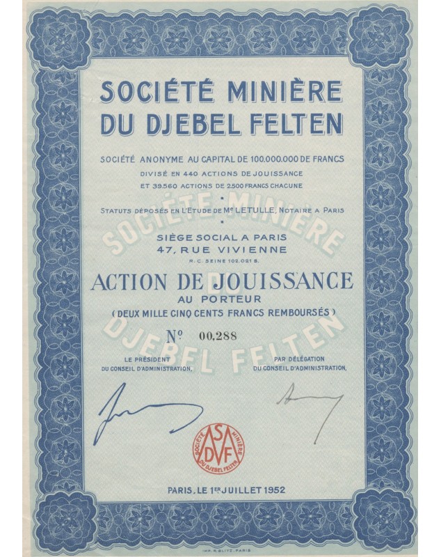 Société fondée par MM. Aulanier et Desportes qui lui apportent la concession de la mine de zinc et plomb du Djebel-Felten à Oued-Seguin (Constantine).