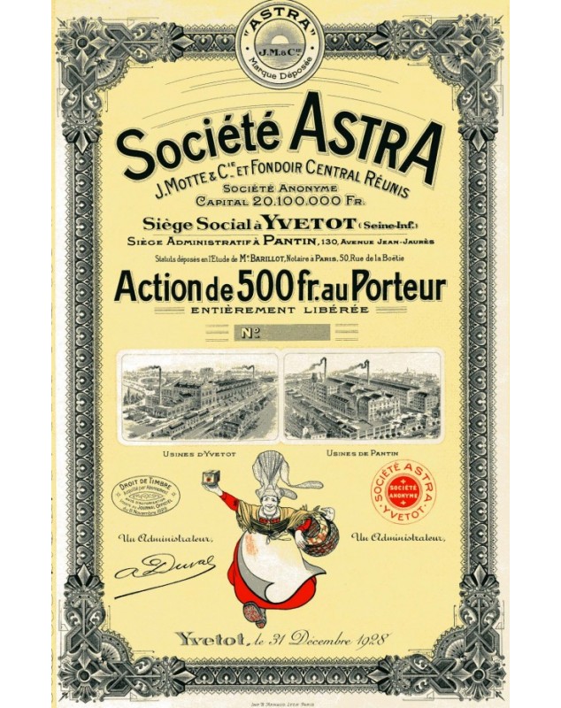 Action de 500 francs au porteur émise à Yvetot en 1928.