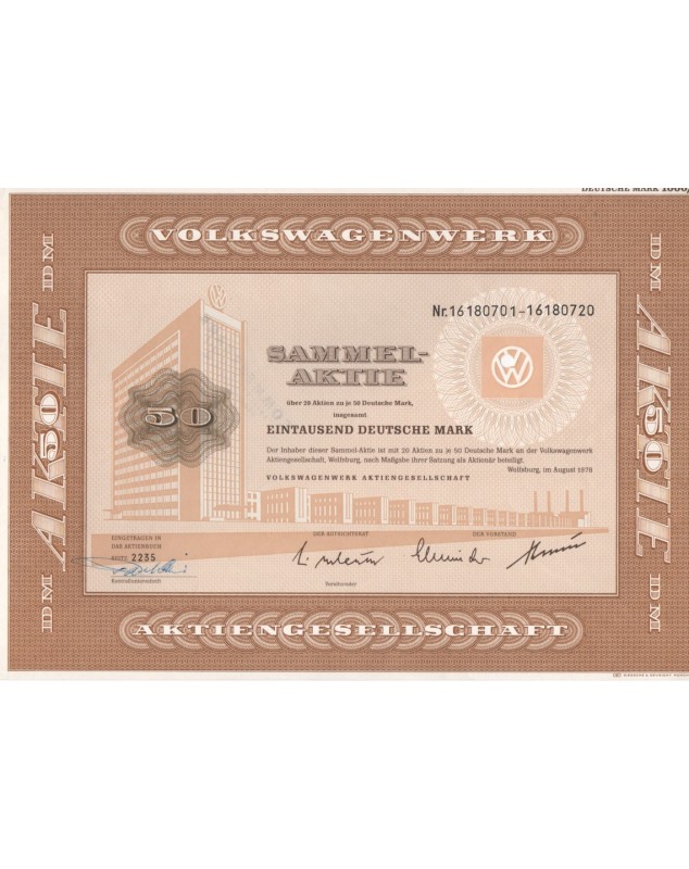 Titre de 20 Actions de 50 DM (=1000DM) - Wolfsburg 1978
