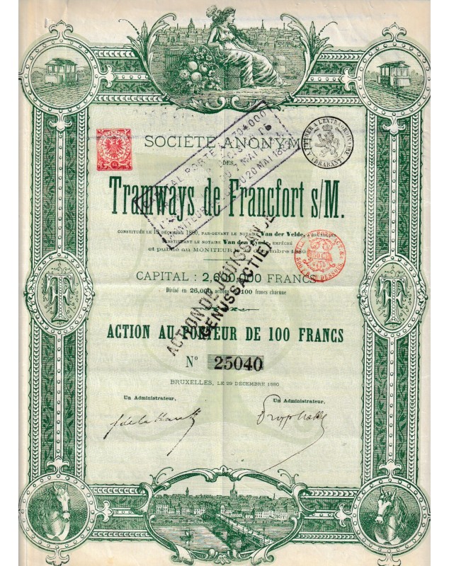 Action de 100 francs au porteur émise à Bruxelles en 1880.