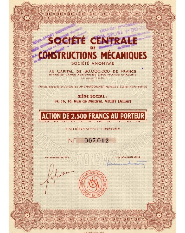 Action au porteur de 2500 francs émise par la Société fondée en 1944 par le stéphanois Louis Rivière à Vichy. La société fabriqua les vélos Thomann et des cyclomoteurs.