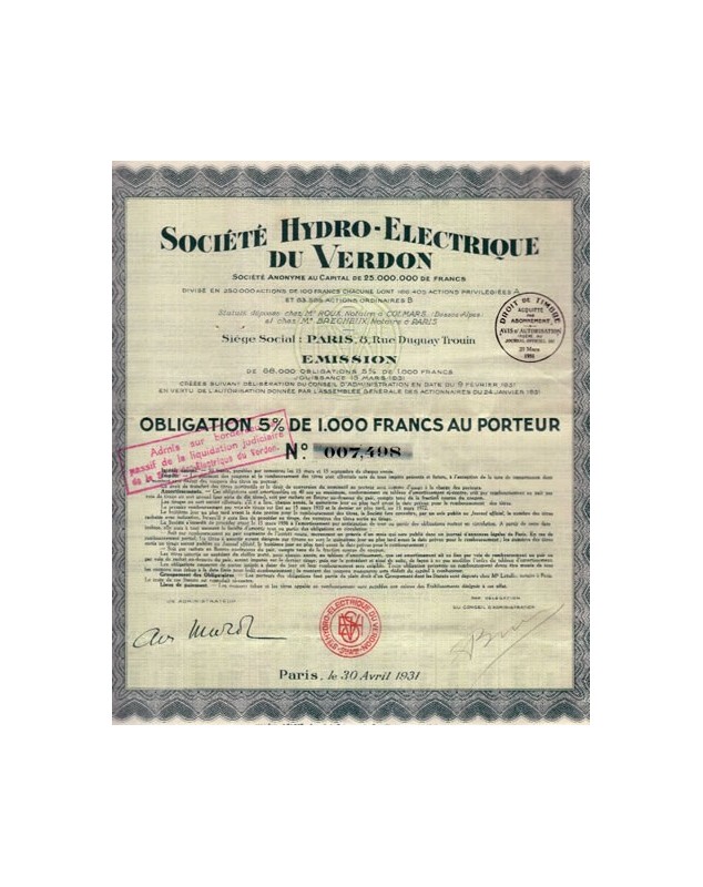 Obligation 5% de 1000F - Paris 1931