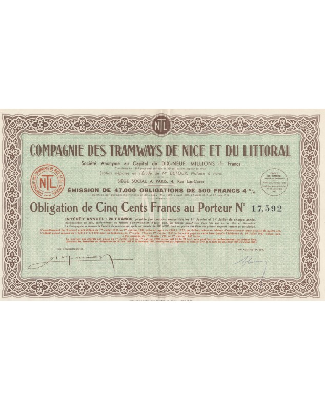 Obligation de 500 francs au porteur émise à Paris en 1940.