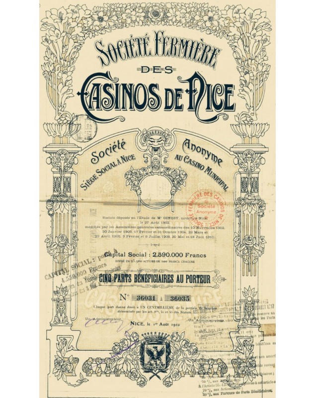 Le casino fut construit en 1884 par Omer Lazard. La société fut fondée en 1902. Elle avait pour objet l’exploitation du Casino Municipal de la Ville de Nice et de ses annexes par la société concessionnaire, Armand et Cie.