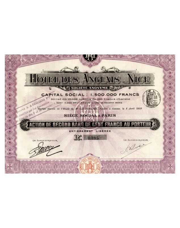 Action de 100 francs au porteur émise à Cannes en 1912.
