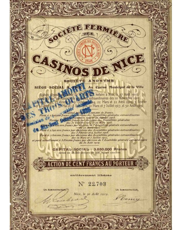 Action de 100 francs émise à Nice en 1919.
