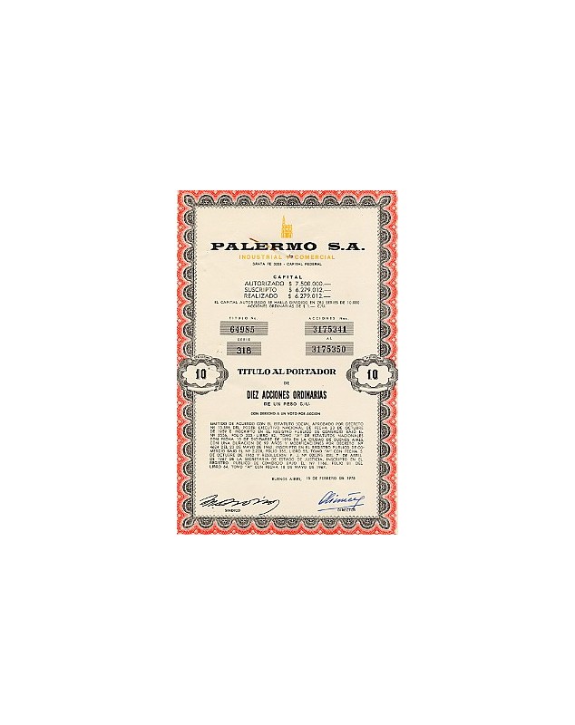 Titre de 10 actions ordinaires de 1 Peso chacune - Buenos Aires 1973